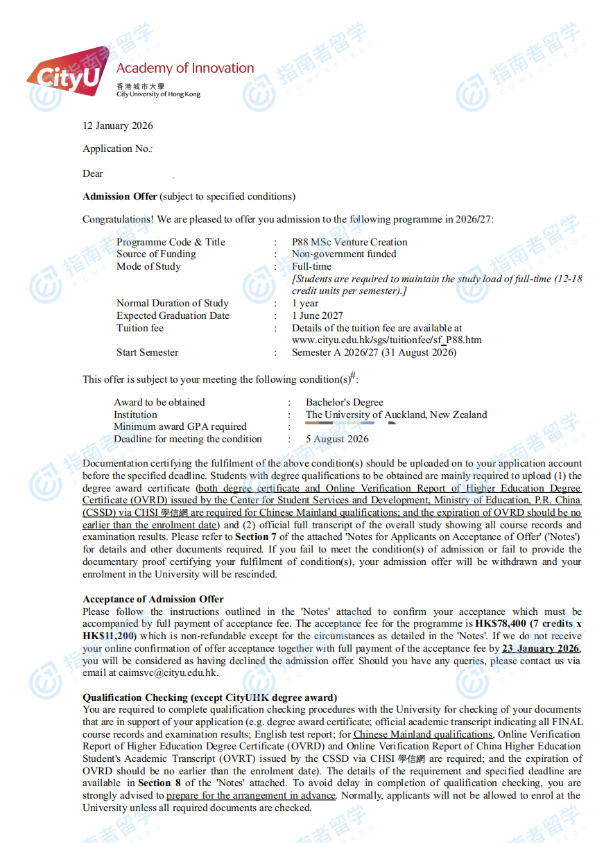 香港城市大學(xué)創(chuàng)新創(chuàng)業(yè)理學(xué)碩士研究生offer一枚