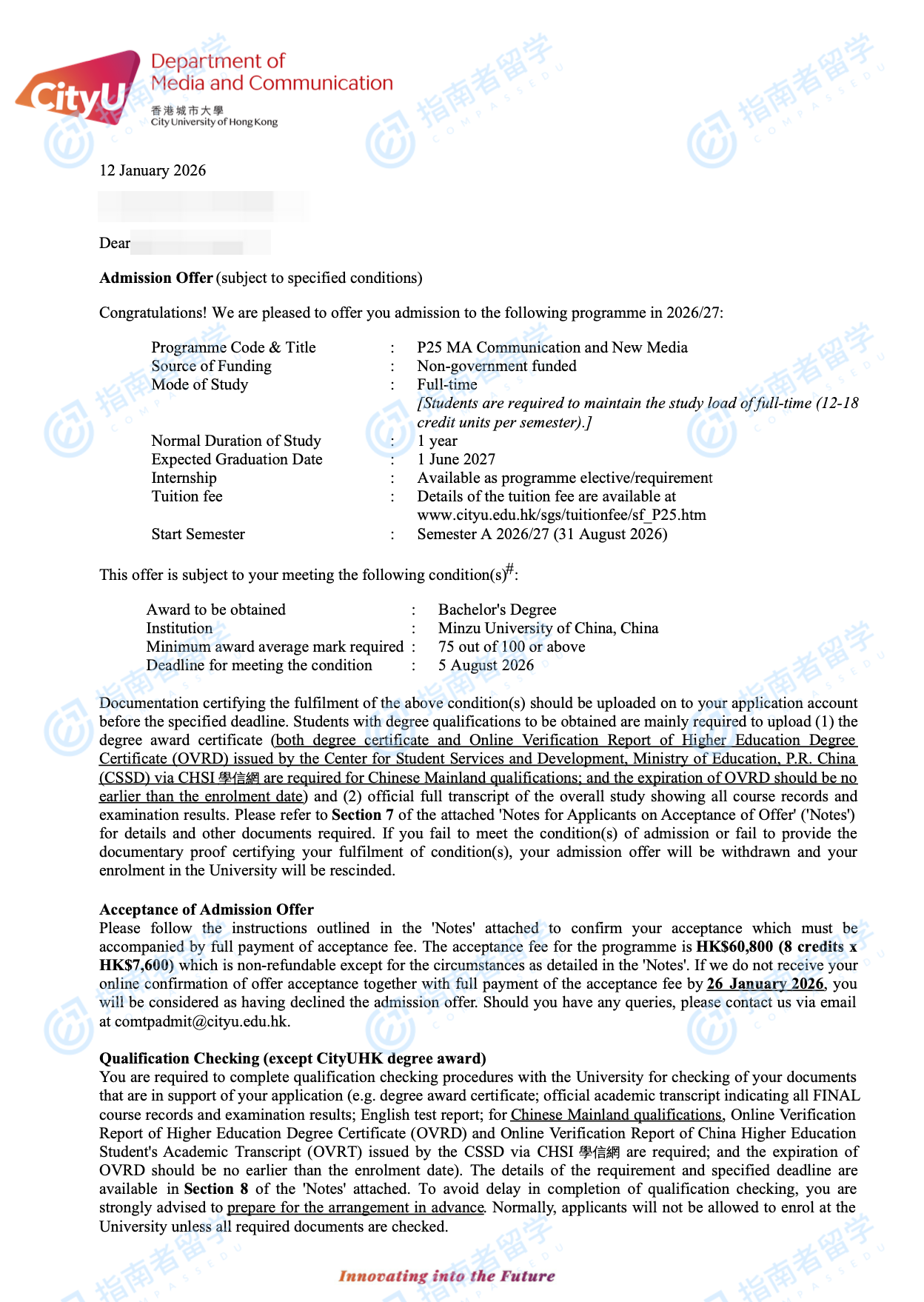 香港城市大學(xué)傳播與新媒體文學(xué)碩士研究生offer一枚