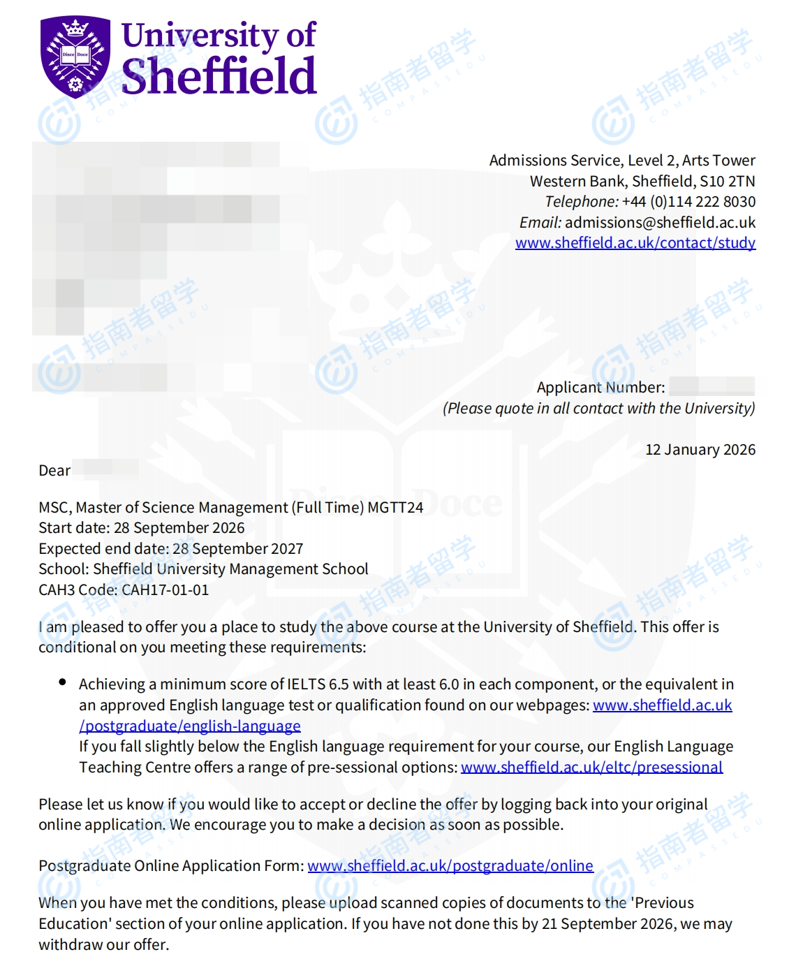 謝菲爾德大學(xué)管理學(xué)理學(xué)碩士研究生offer一枚