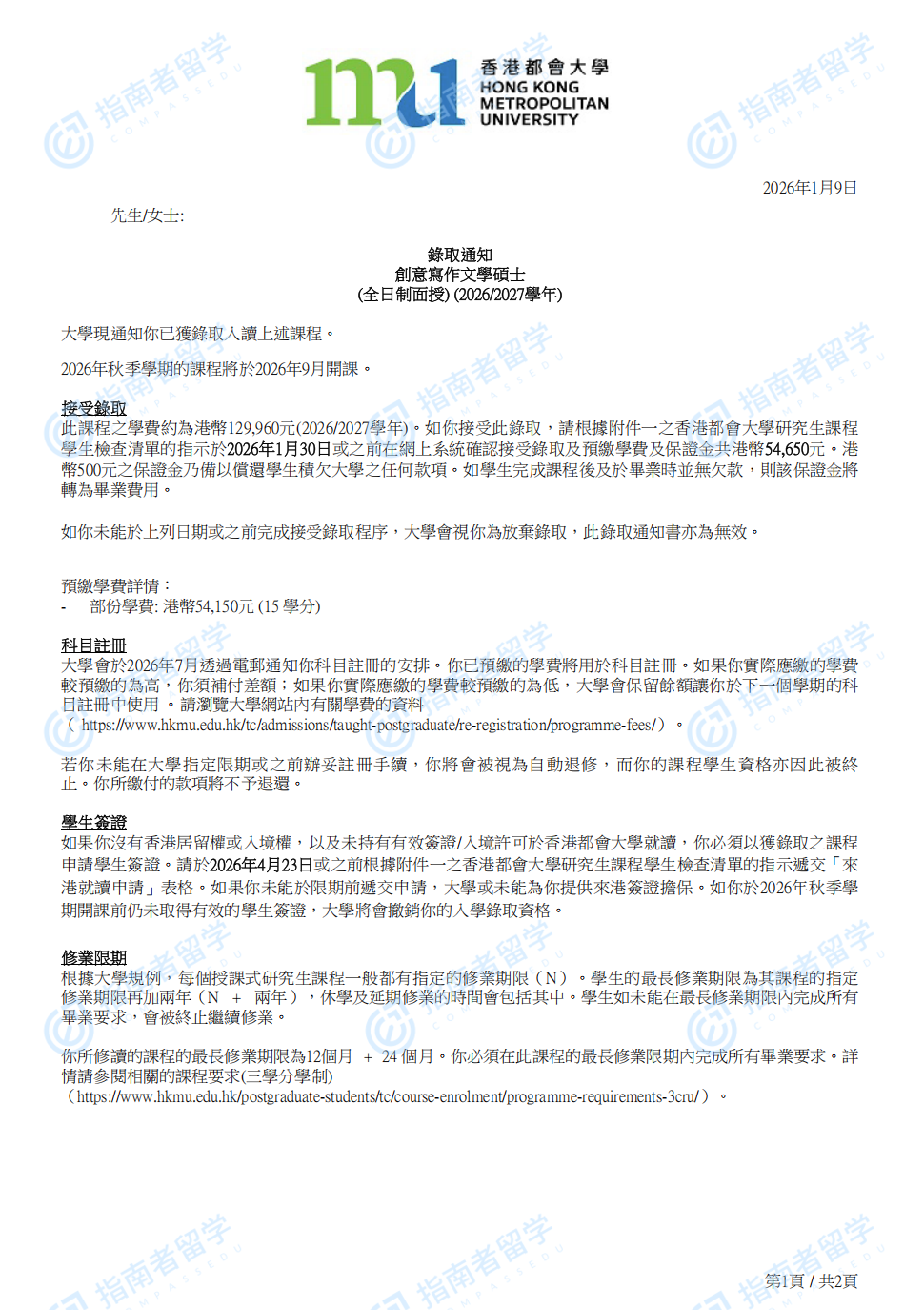香港都會大學創(chuàng)意寫作文學碩士研究生offer一枚