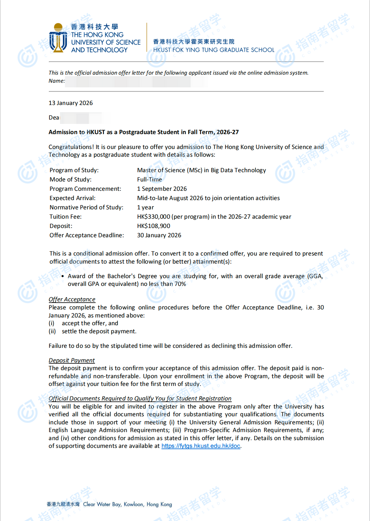 香港科技大學(xué)大數(shù)據(jù)科技理學(xué)碩士研究生offer一枚