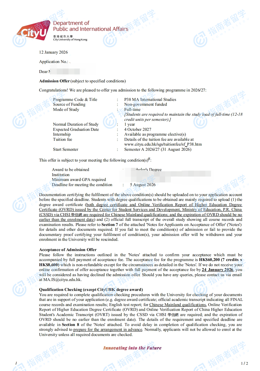 香港城市大學(xué)國際研究文學(xué)碩士研究生offer一枚