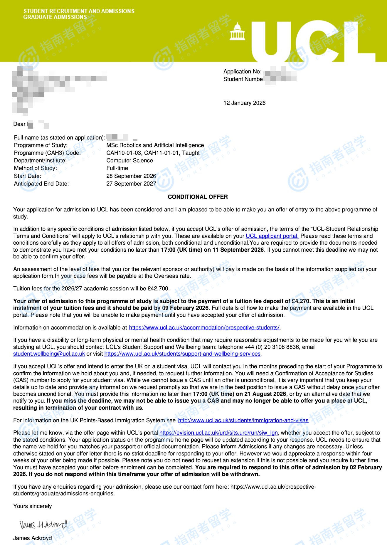 倫敦大學(xué)學(xué)院機(jī)器人與人工智能理學(xué)碩士研究生offer一枚