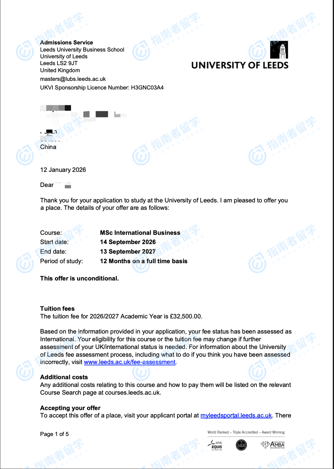 利茲大學(xué)國(guó)際商務(wù)理學(xué)碩士研究生offer一枚