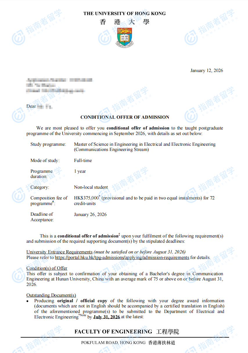香港大學(xué)電氣與電子工程(工程)理學(xué)碩士 - 通信工程方向研究生offer一枚