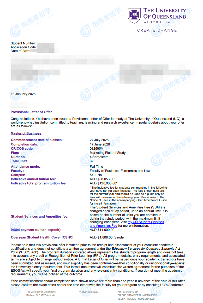 昆士蘭大學(xué)商業(yè)碩士(1.5年制)研究生offer一枚