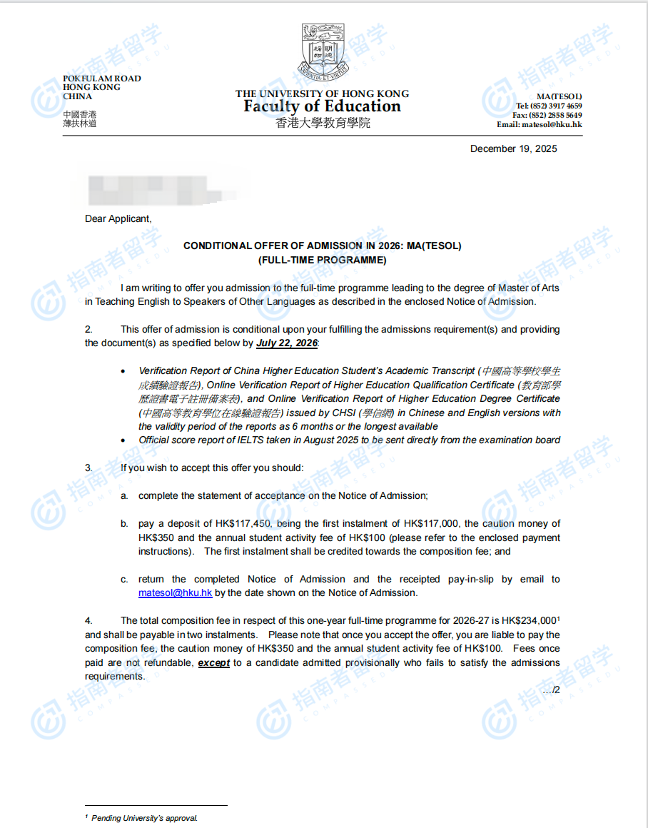 香港中文大學對外英語教學文學碩士研究生offer一枚