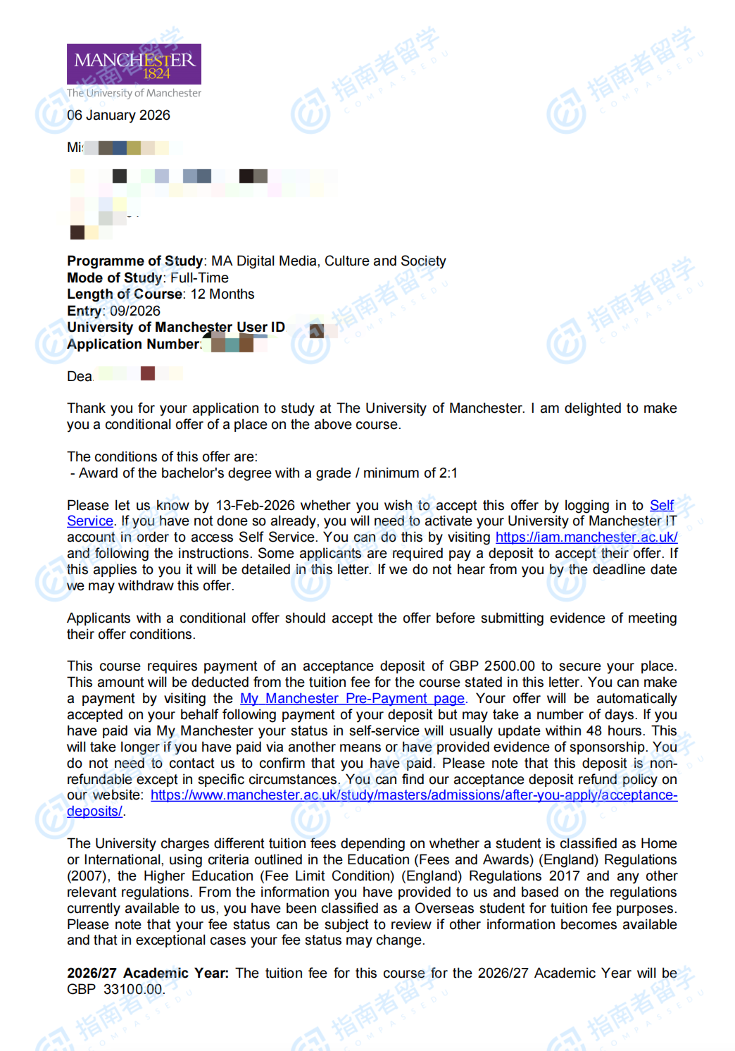 曼徹斯特大學(xué)數(shù)字媒體、文化與社會(huì)文學(xué)碩士研究生offer一枚