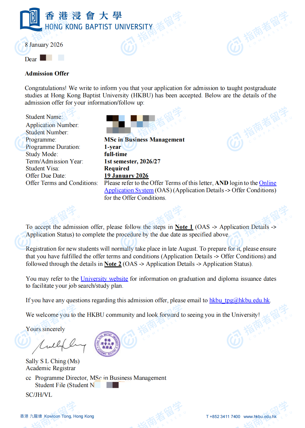 香港浸會大學商業(yè)管理理學碩士研究生offer一枚