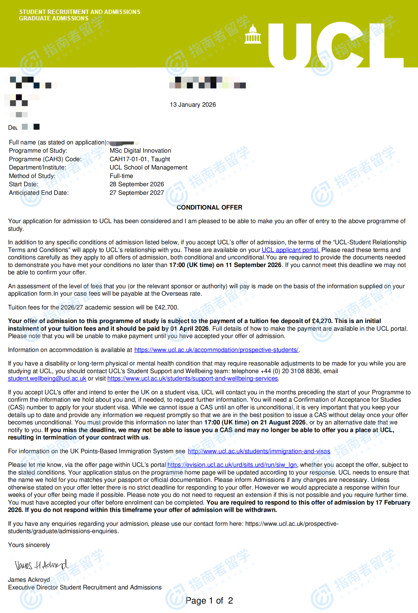 倫敦大學(xué)學(xué)院數(shù)字創(chuàng)新理學(xué)碩士研究生offer一枚