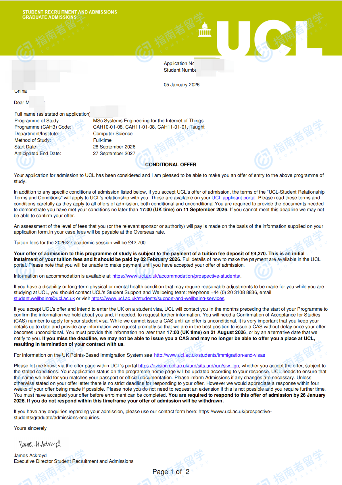 倫敦大學學院物聯(lián)網(wǎng)系統(tǒng)工程理學碩士研究生offer一枚