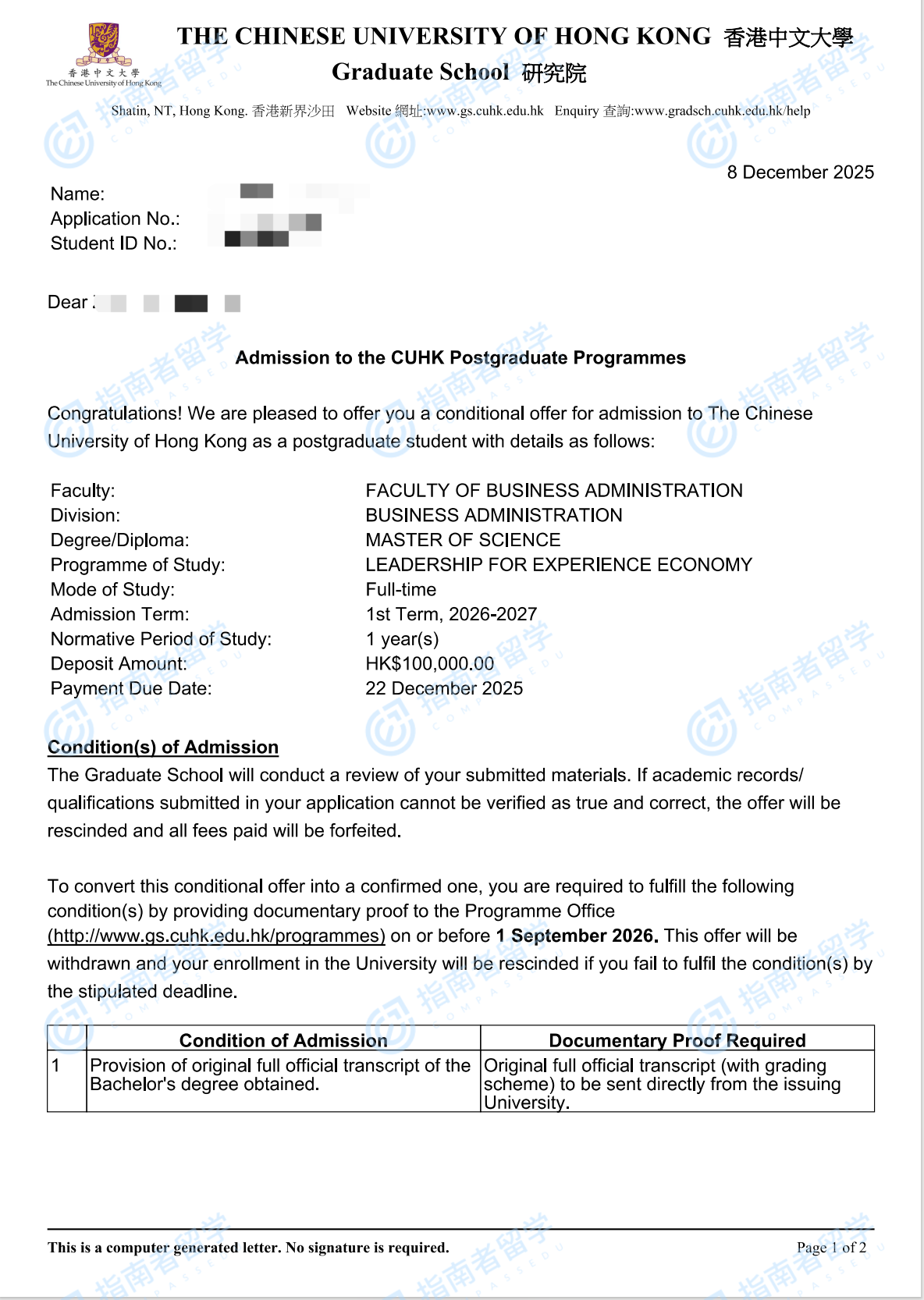 香港中文大學(xué)體驗經(jīng)濟領(lǐng)導(dǎo)力理學(xué)碩士研究生offer一枚