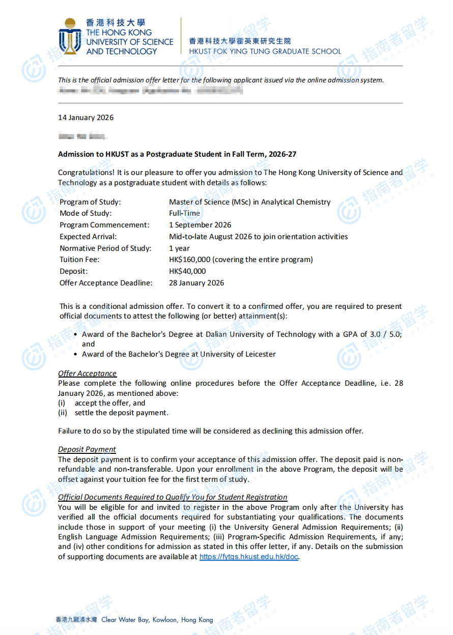 香港科技大學(xué)分析化學(xué)理學(xué)碩士研究生offer一枚