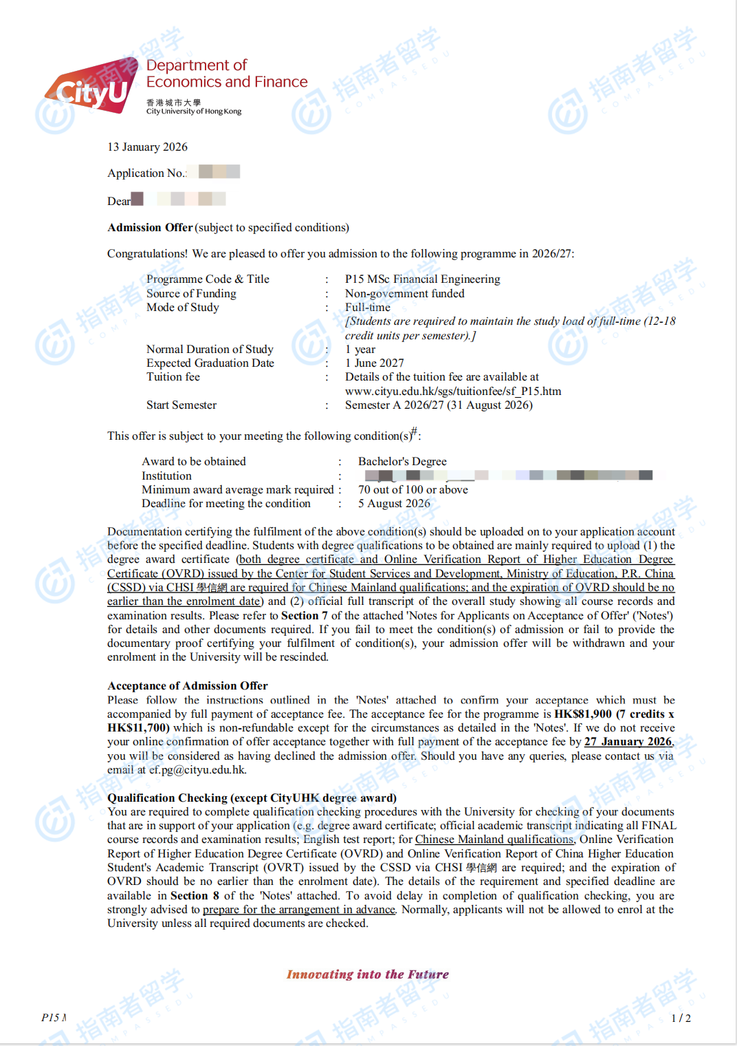香港城市大學(xué)金融工程學(xué)理學(xué)碩士研究生offer一枚