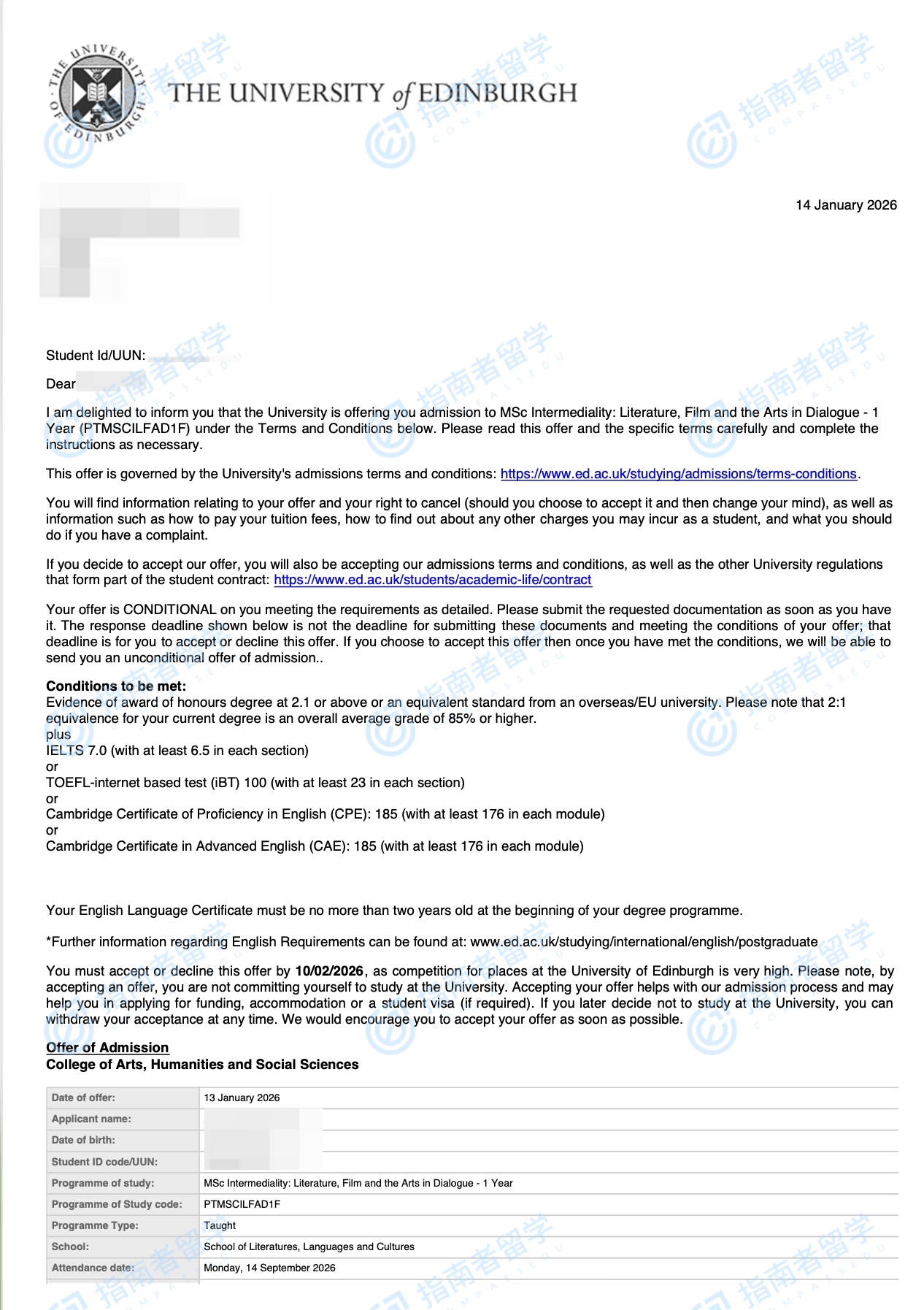 愛丁堡大學(xué)媒介間性:文學(xué)、電影與對話中的藝術(shù)理學(xué)碩士研究生offer一枚