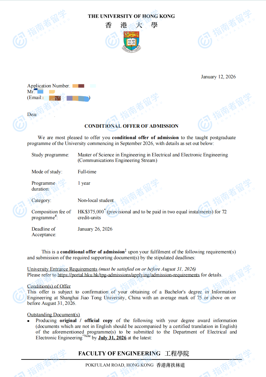 香港大學(xué)電氣與電子工程(工程)理學(xué)碩士 - 通信工程方向研究生offer一枚