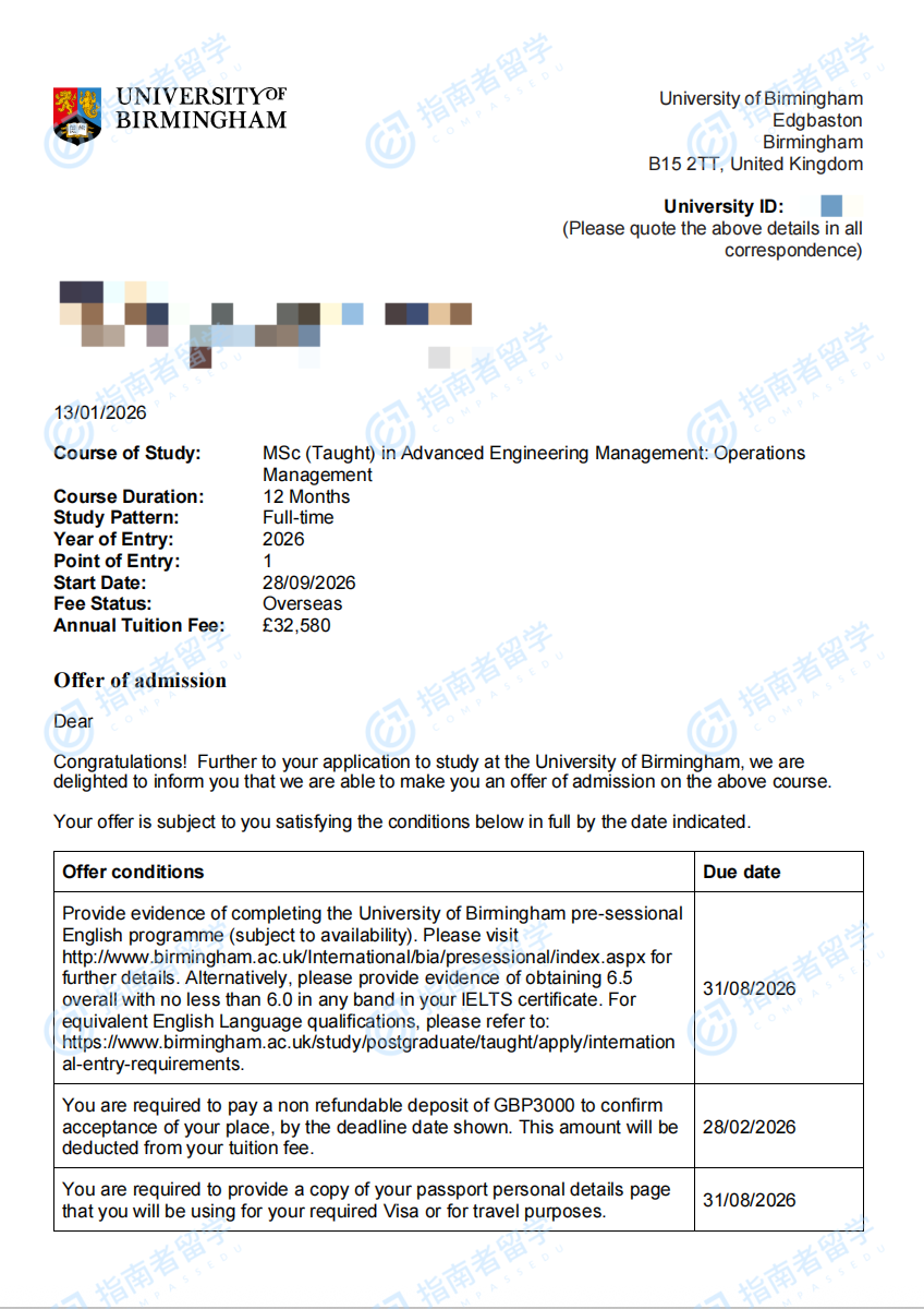 伯明翰大學(xué)高級工程管理(運營管理)理學(xué)碩士研究生offer一枚