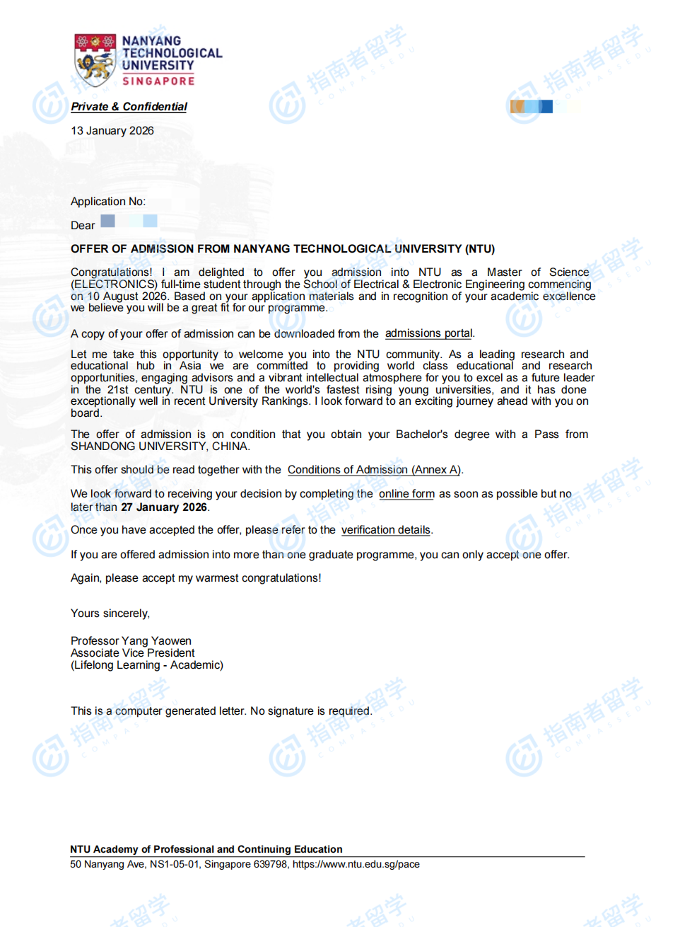 南洋理工大學(xué)電子學(xué)理學(xué)碩士研究生offer一枚