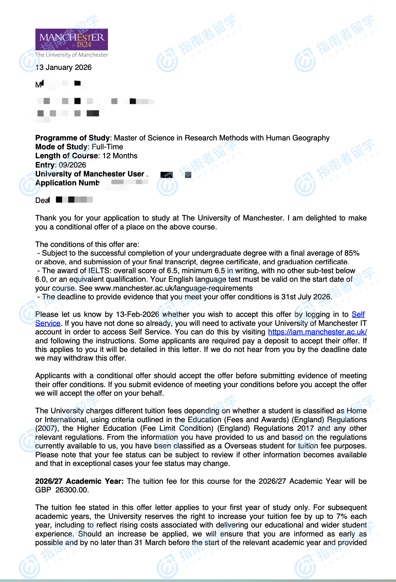 曼徹斯特大學人文地理學研究方法理學碩士研究生offer一枚