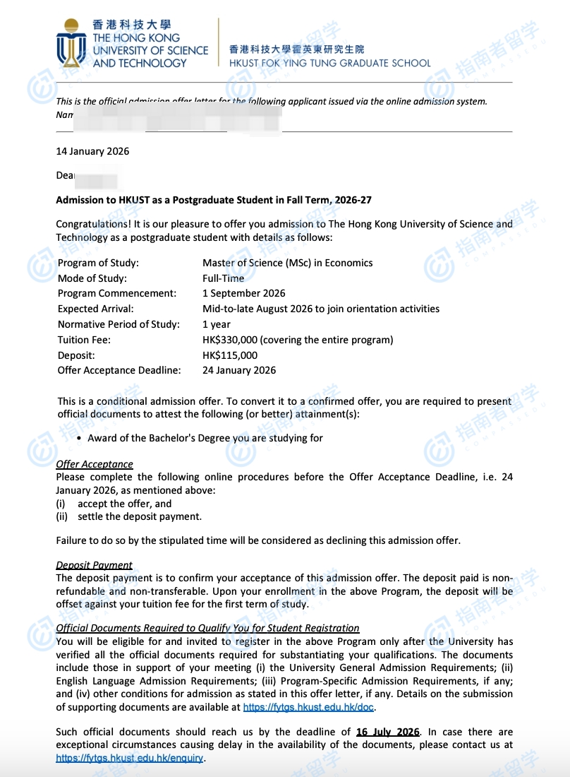 香港科技大學經濟學理學碩士研究生offer一枚