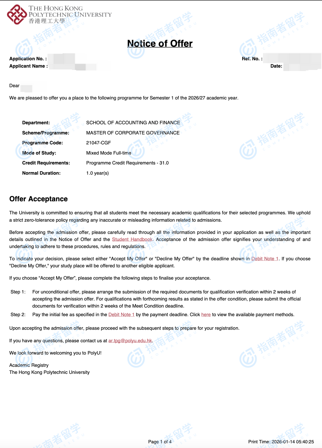 香港理工大學(xué)公司管治碩士研究生offer一枚