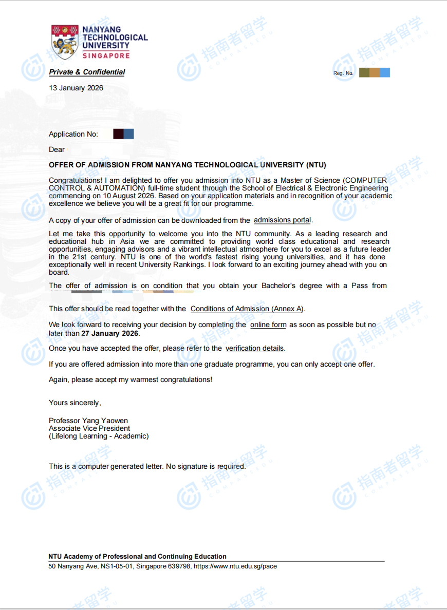 南洋理工大學(xué)計(jì)算機(jī)控制與自動化理學(xué)碩士研究生offer一枚