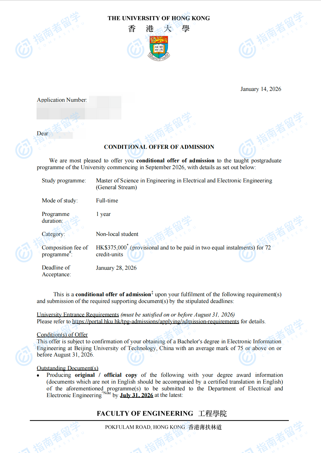 香港大學(xué)電氣與電子工程(工程)理學(xué)碩士 - 常規(guī)方向研究生offer一枚