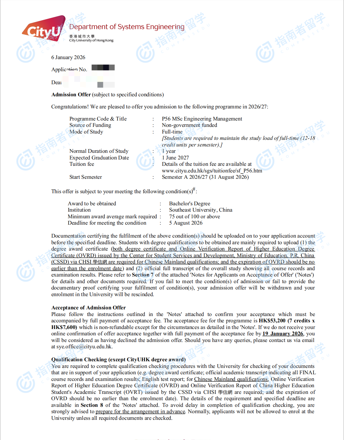 香港城市大學(xué)工程管理學(xué)理學(xué)碩士研究生offer一枚