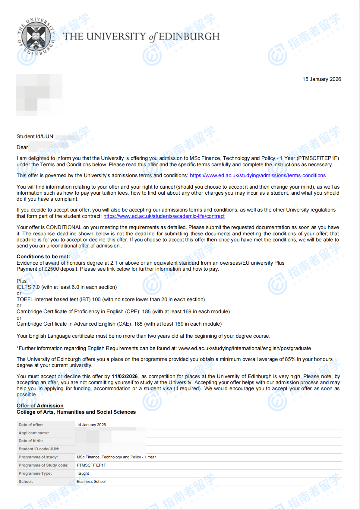 愛丁堡大學金融、科技與政策理學碩士研究生offer一枚