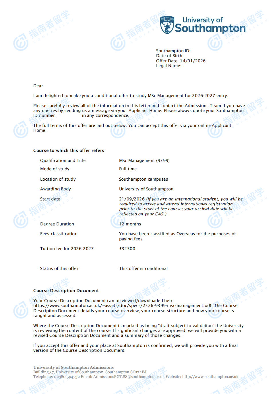 南安普頓大學(xué)管理學(xué)理學(xué)碩士研究生offer一枚
