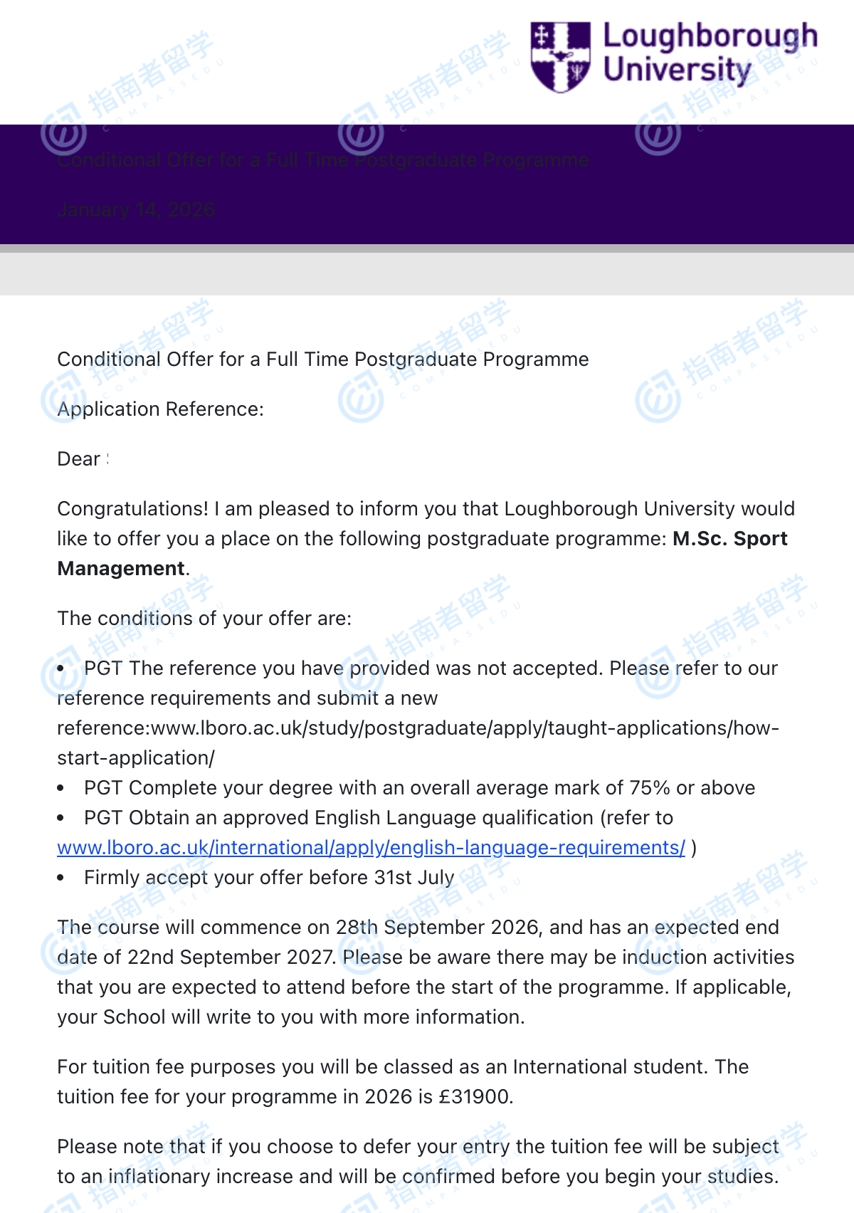 拉夫堡大學(xué)體育營銷理學(xué)碩士研究生offer一枚