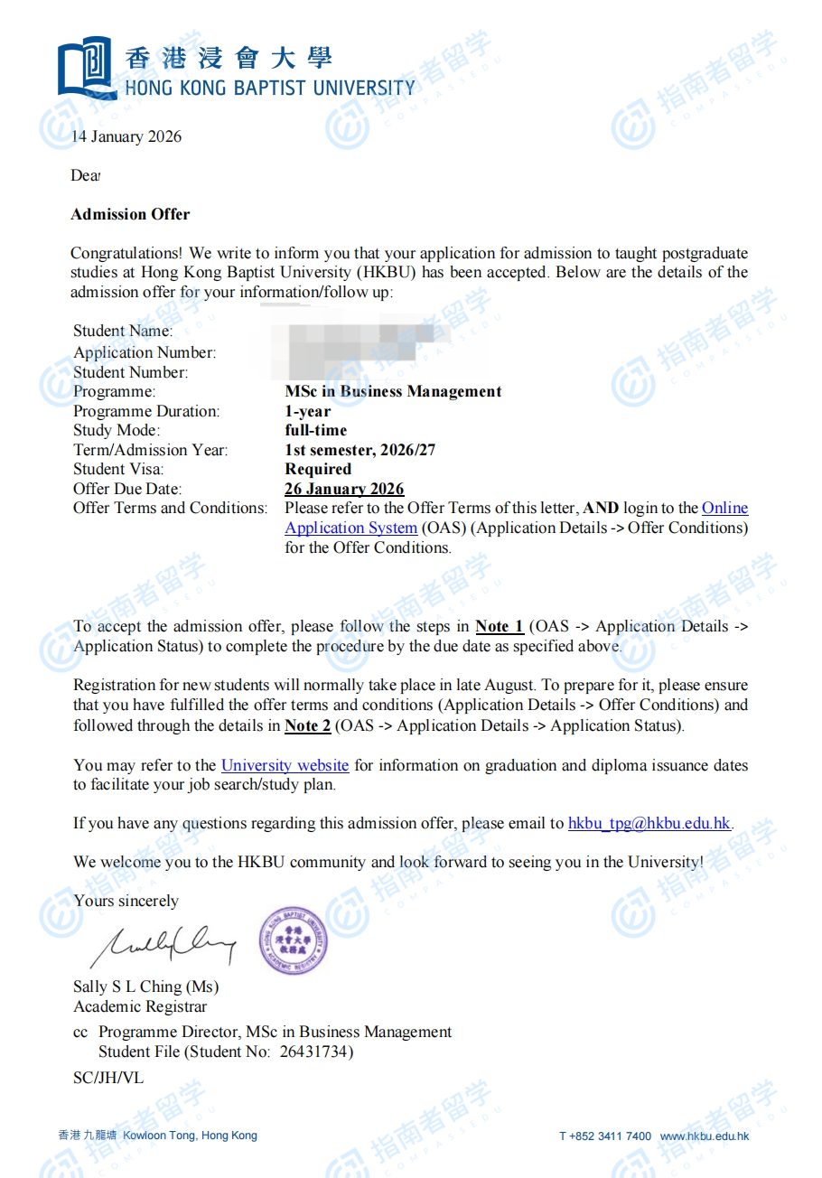香港浸會(huì)大學(xué)商業(yè)管理理學(xué)碩士研究生offer一枚