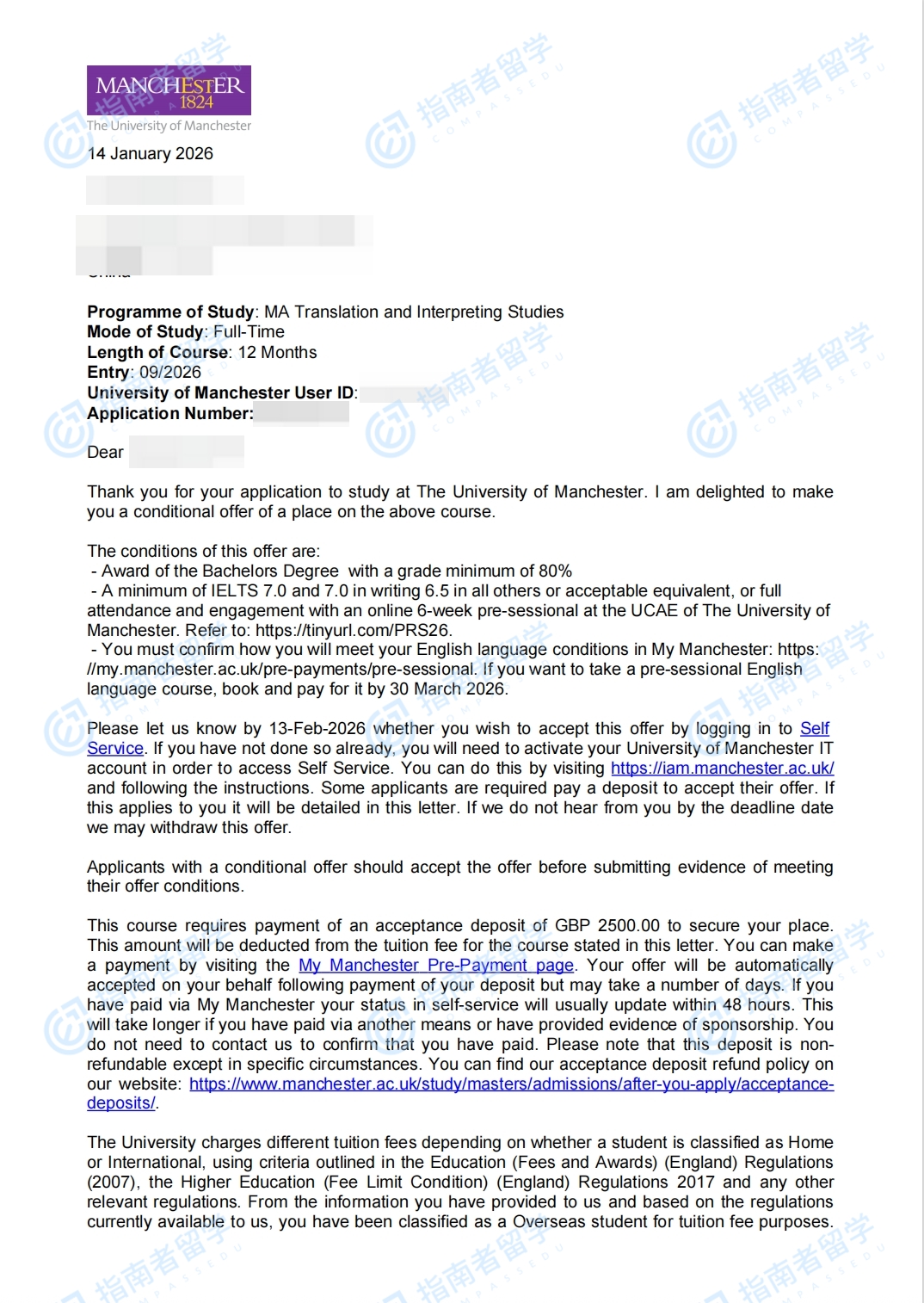 曼徹斯特大學(xué)筆譯與口譯研究文學(xué)碩士研究生offer一枚