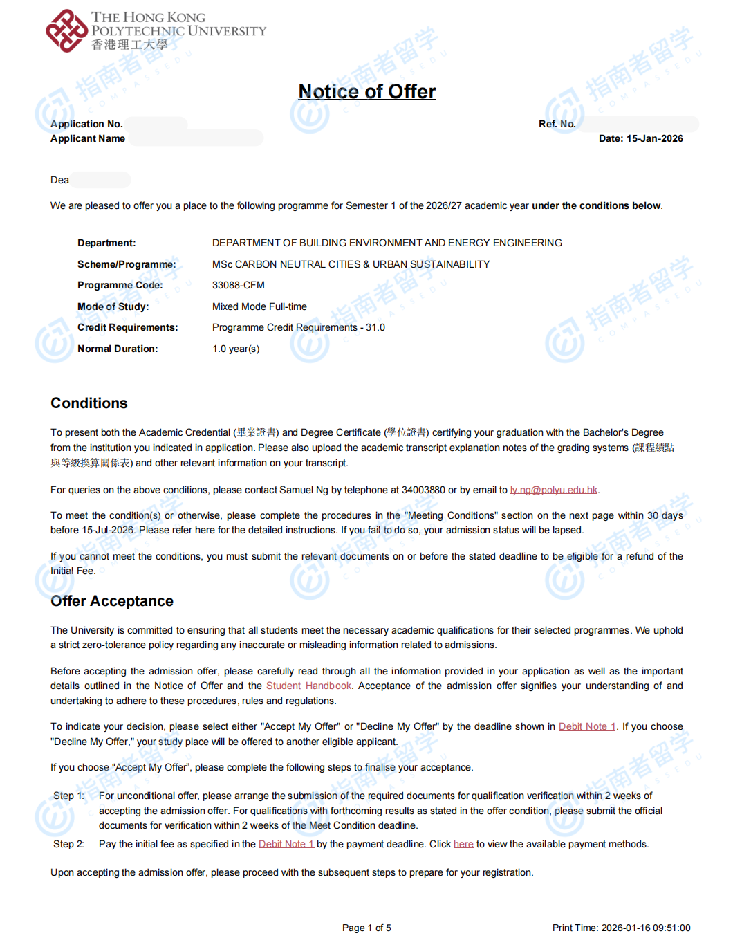 香港理工大學(xué)碳中和城市及可持續(xù)性理學(xué)碩士研究生offer一枚
