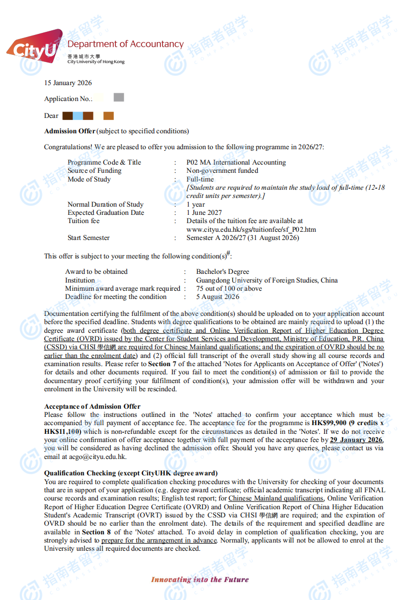 香港城市大學(xué)國際會計學(xué)文學(xué)碩士研究生offer一枚