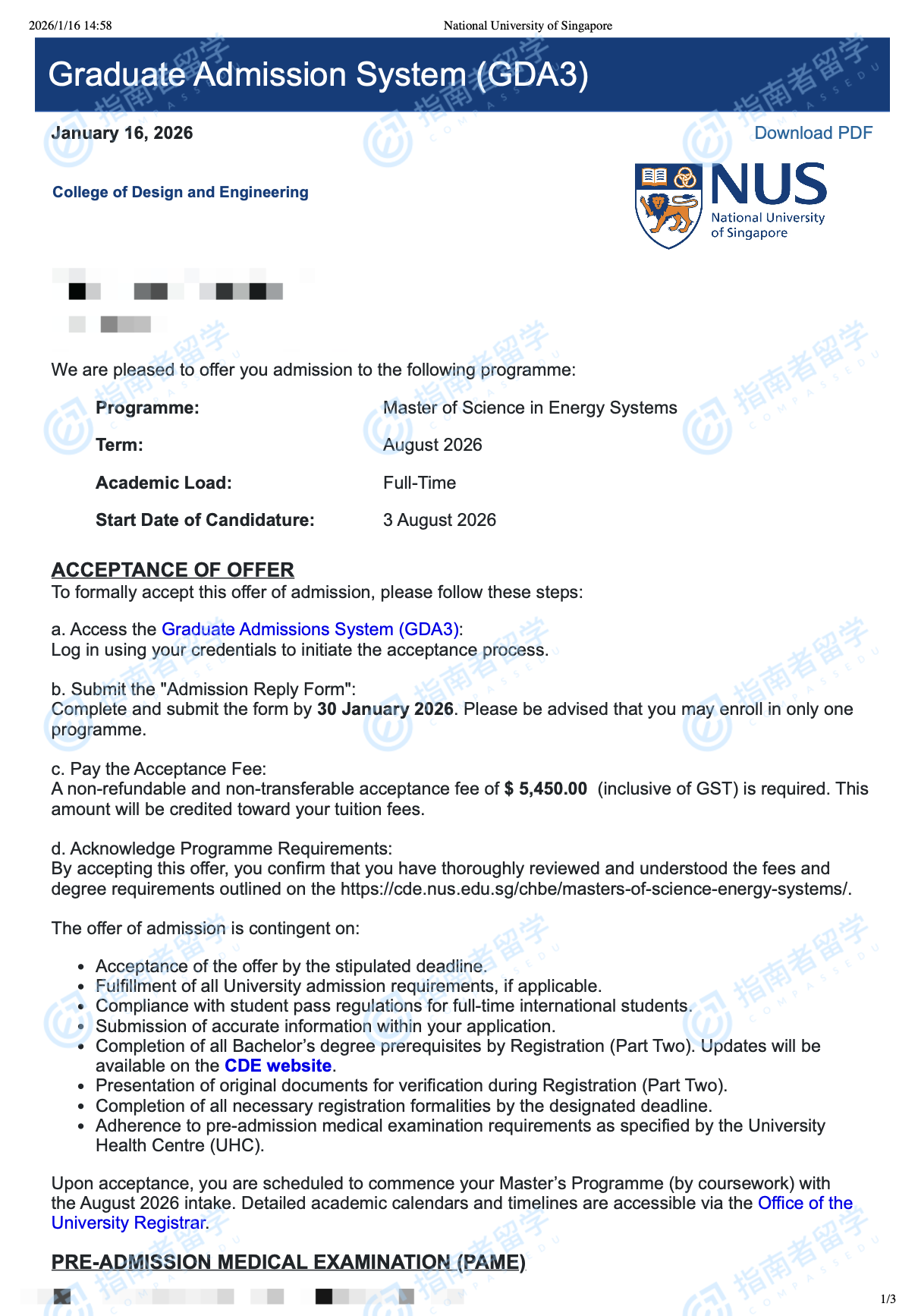 新加坡國(guó)立大學(xué)能源系統(tǒng)理學(xué)碩士研究生offer一枚