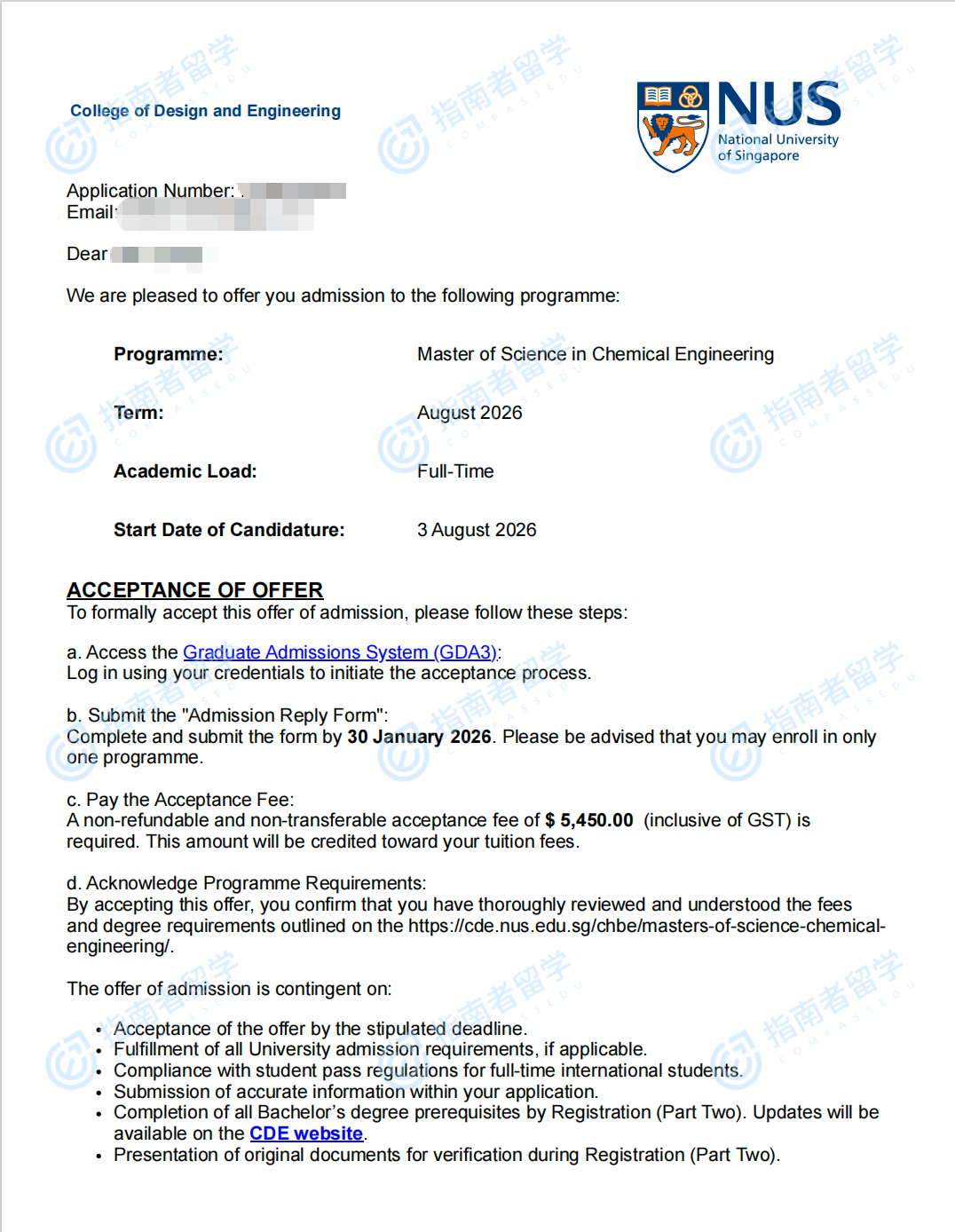 新加坡國立大學化學工程理學碩士研究生offer一枚