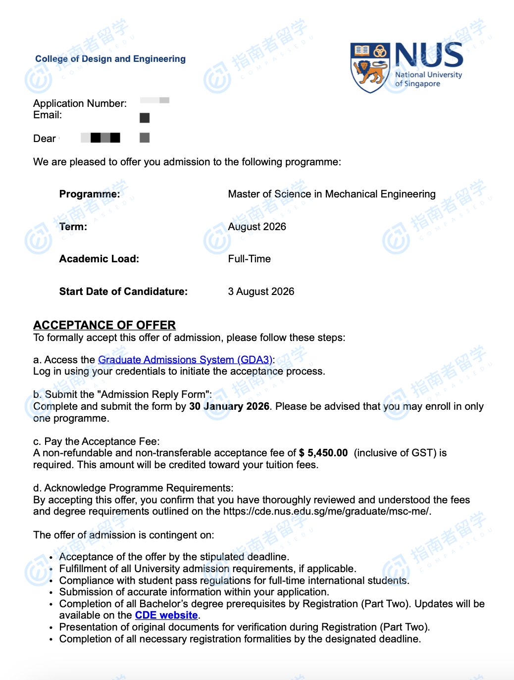 新加坡國立大學(xué)機(jī)械工程理學(xué)碩士研究生offer一枚