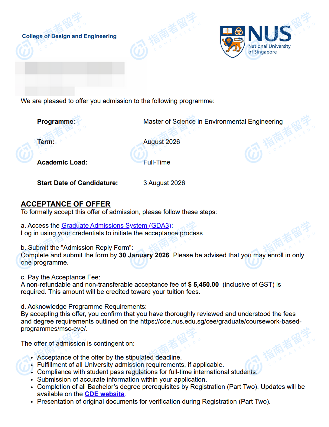 新加坡國立大學環(huán)境工程理學碩士研究生offer一枚