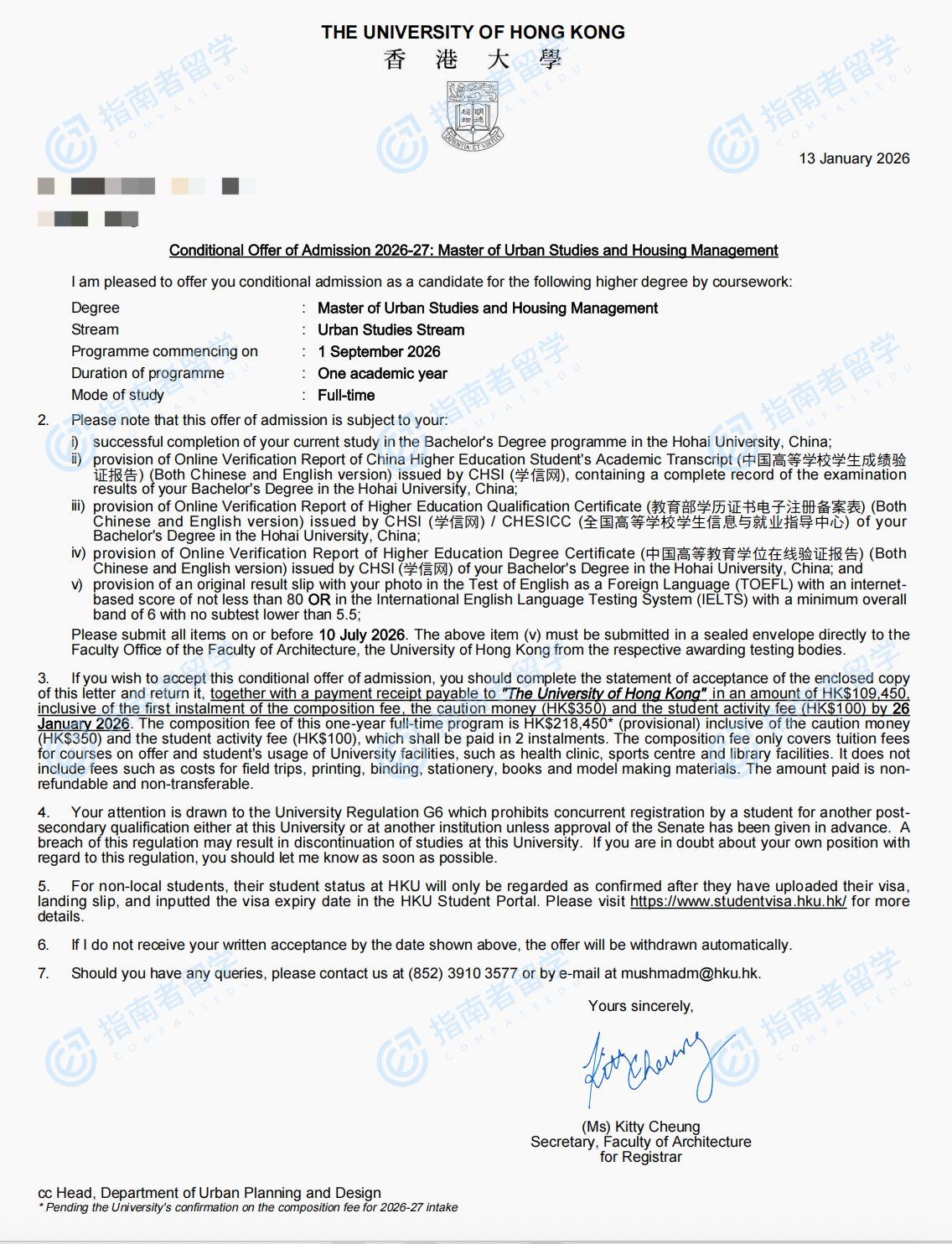 香港大學(xué)城市研究與住房管理碩士(專業(yè))研究生offer一枚