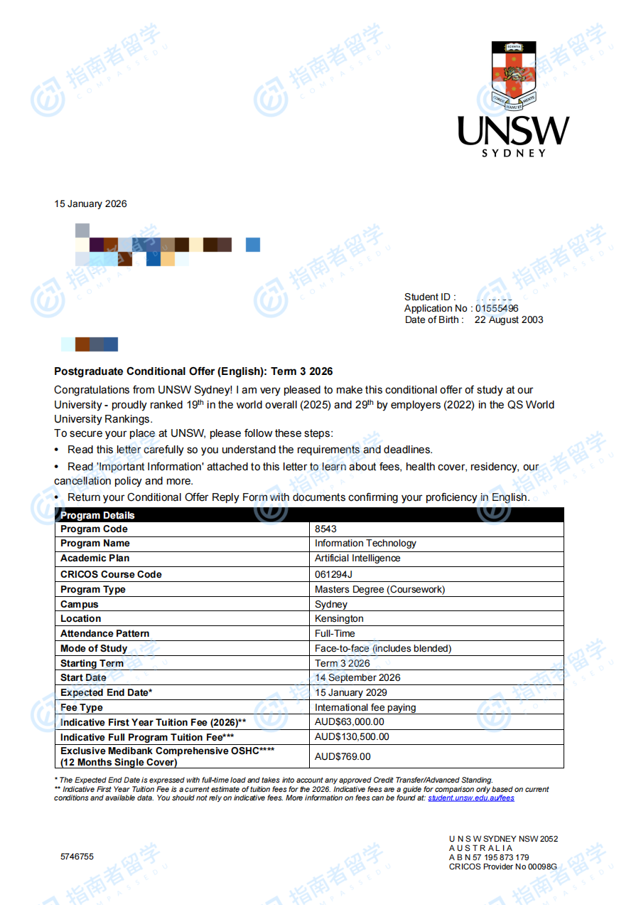 成功的申請者將通過Graduate Certificate in Information Technology/Master of Information Technology pathway進入Master of Information Technology課程,學生在完成18個學分的基礎(chǔ)課程后可轉(zhuǎn)入Master of Information Technology,總學習時間與具有相關(guān)背景的學生相同(2年/96 UoC),該課程不需要單獨申請,非相關(guān)背景的申請者必須申請Master of Information Technology才能被考慮打包錄取<br>