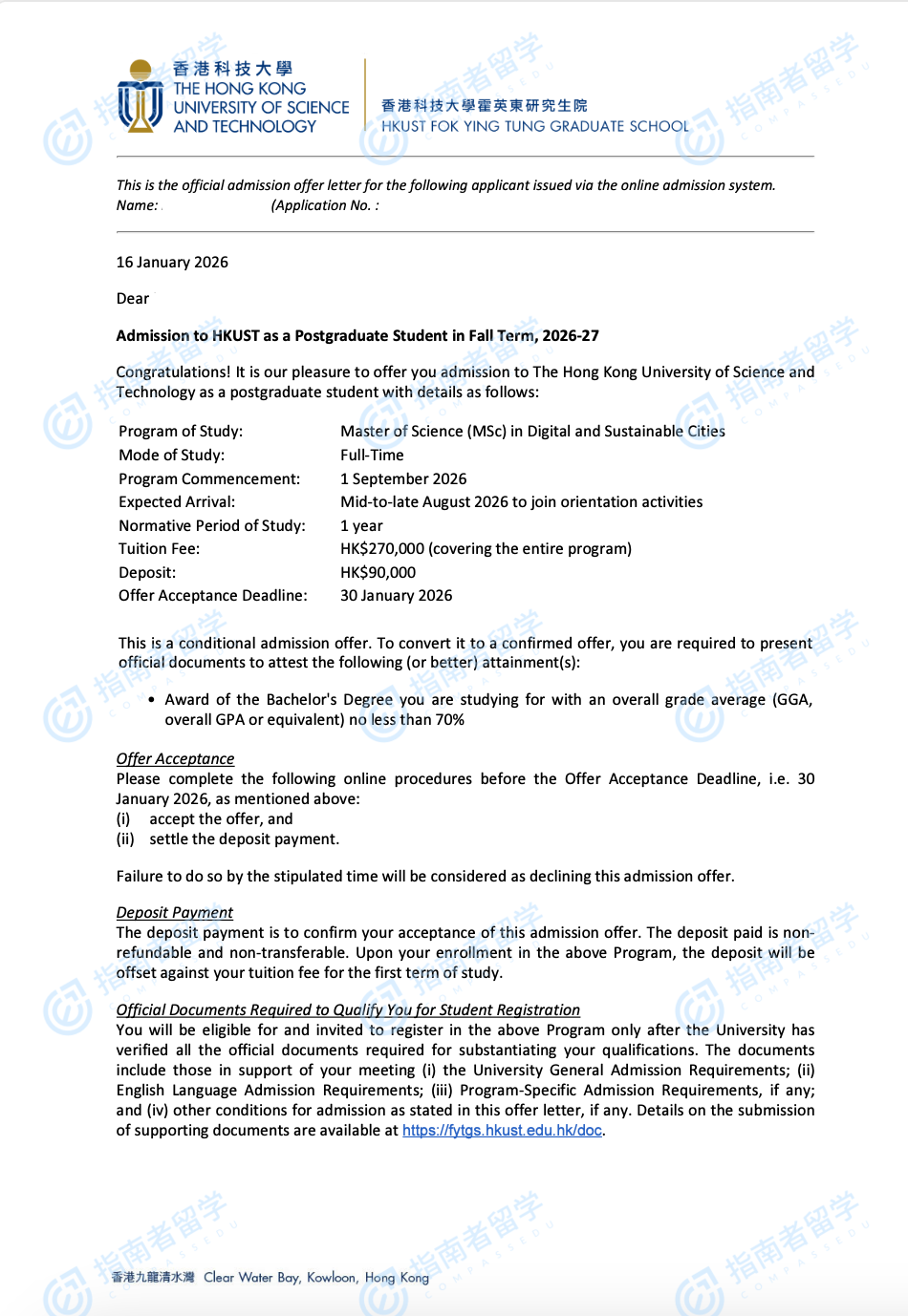 香港科技大學(xué)數(shù)字與可持續(xù)城市理學(xué)碩士研究生offer一枚
