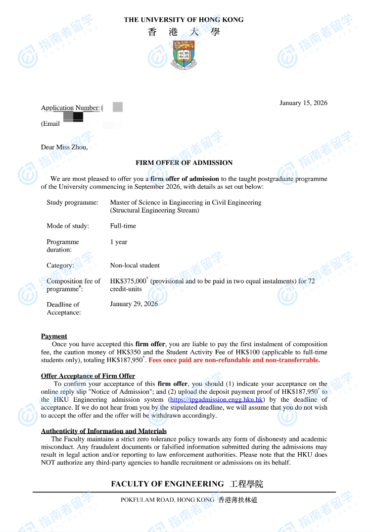 香港大學(xué)土木工程(工程)理學(xué)碩士 - 結(jié)構(gòu)工程方向研究生offer一枚