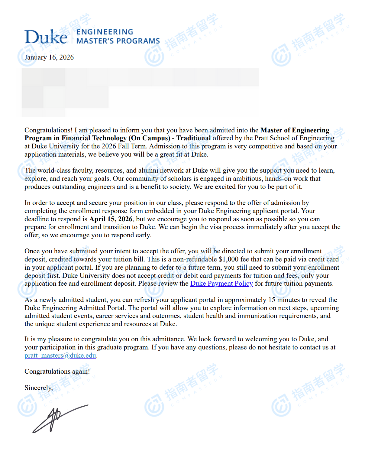 杜克大學(xué)金融科技學(xué)碩士研究生offer一枚