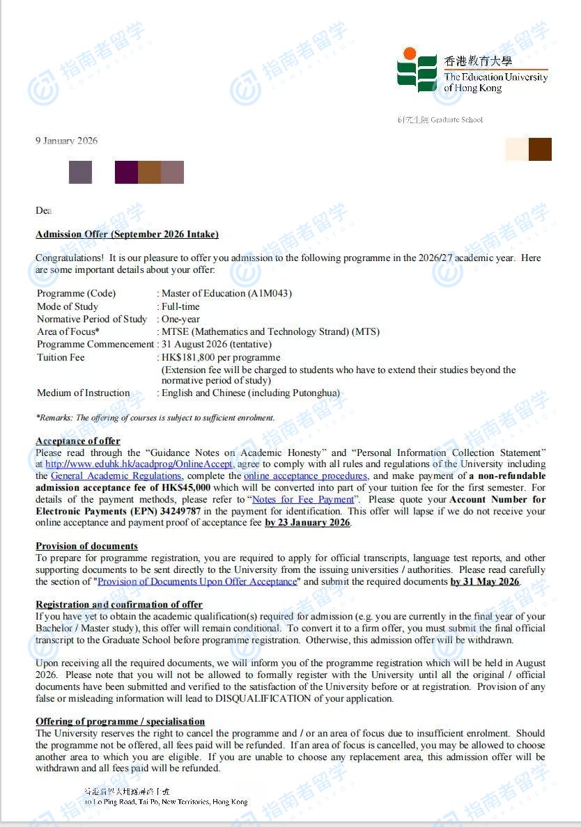 香港教育大學(xué)教學(xué)碩士研究生offer一枚