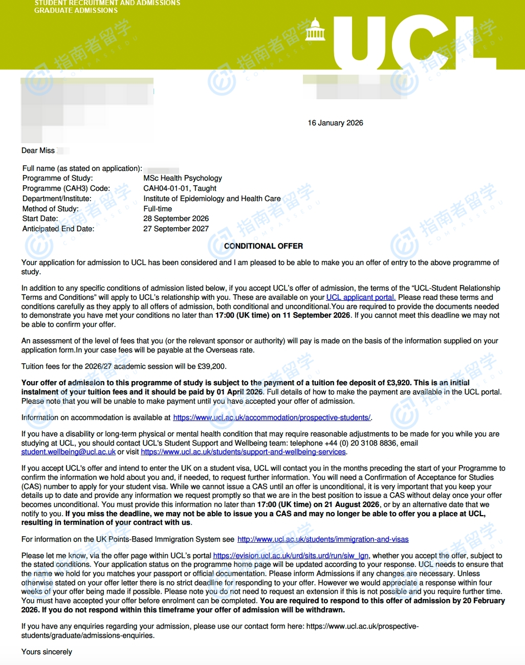 倫敦大學(xué)學(xué)院健康心理學(xué)理學(xué)碩士研究生offer一枚