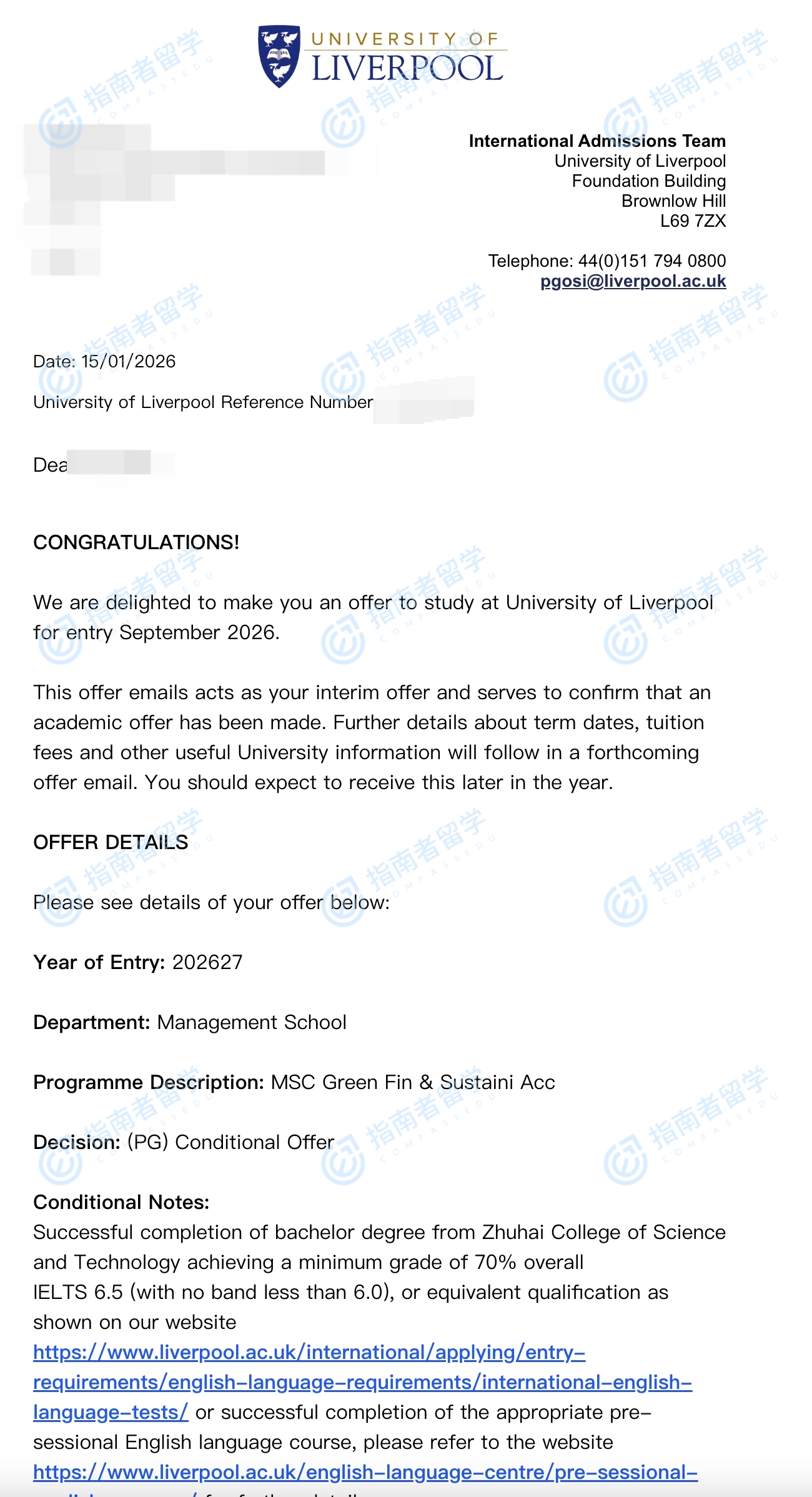 利物浦大學(xué)會計與金融理學(xué)碩士研究生offer一枚