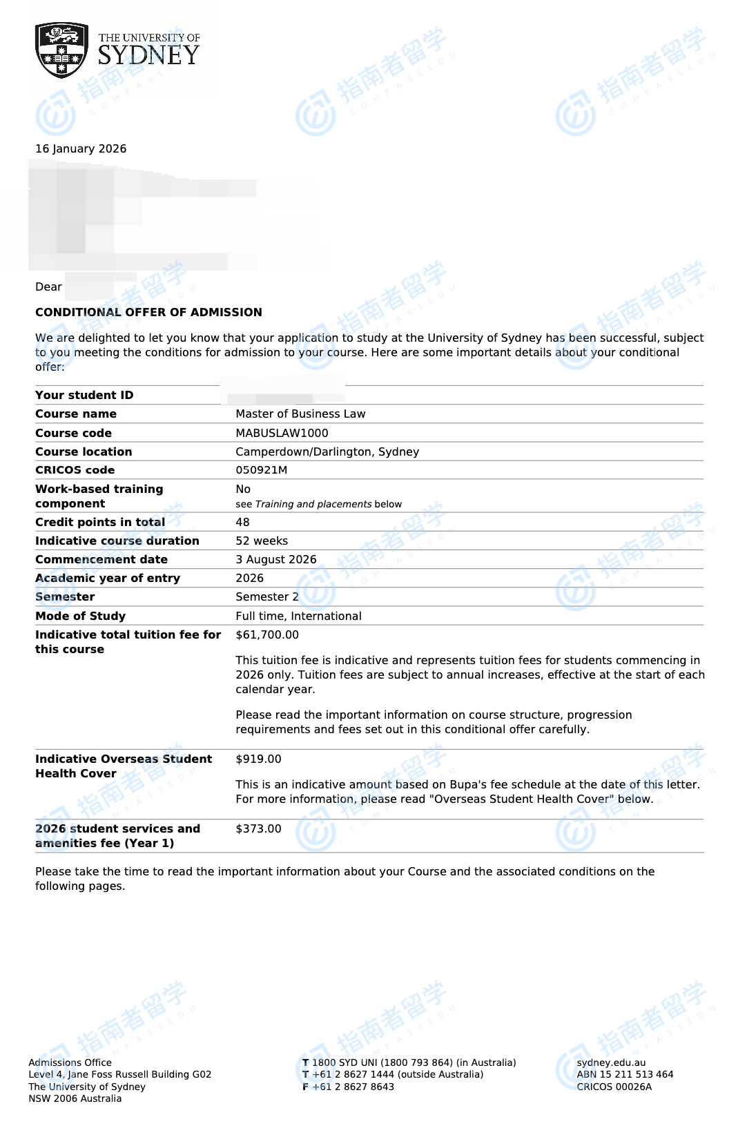 悉尼大學(xué)商業(yè)法碩士研究生offer一枚