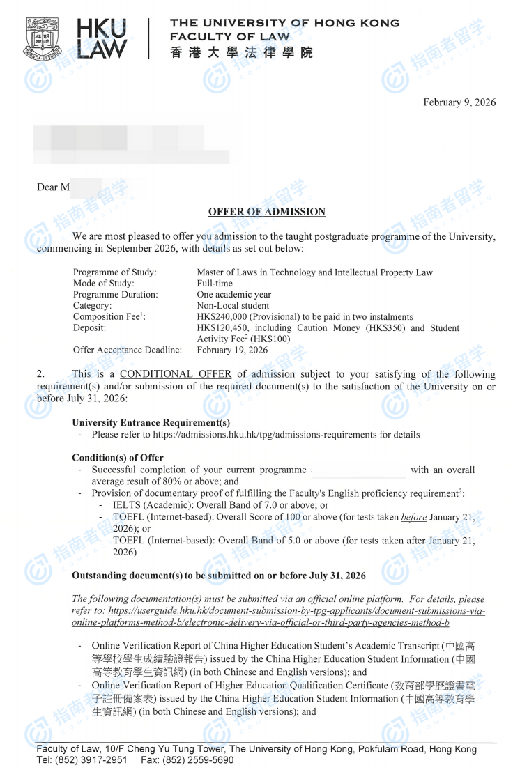 香港大學(xué)技術(shù)與知識(shí)產(chǎn)權(quán)法法學(xué)碩士研究生offer一枚