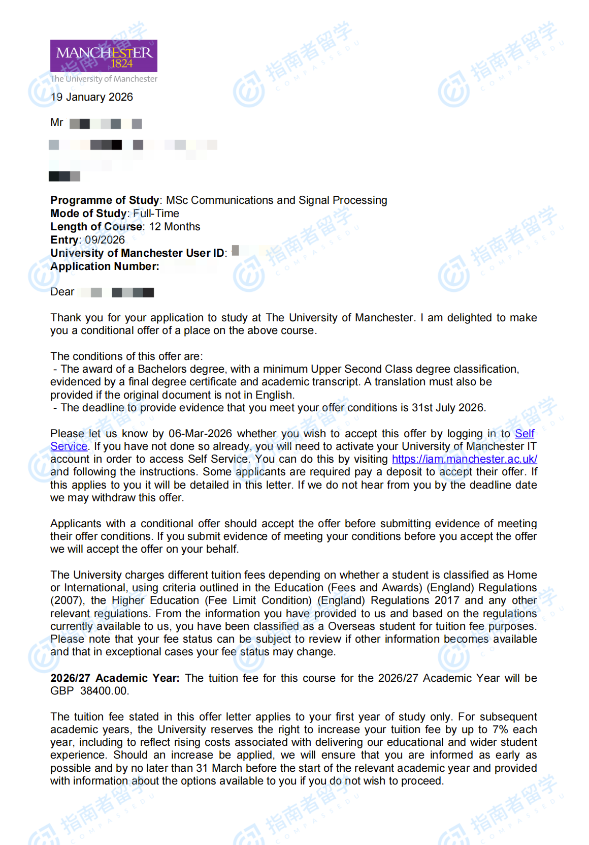 曼徹斯特大學(xué)通信與信號(hào)處理理學(xué)碩士研究生offer一枚